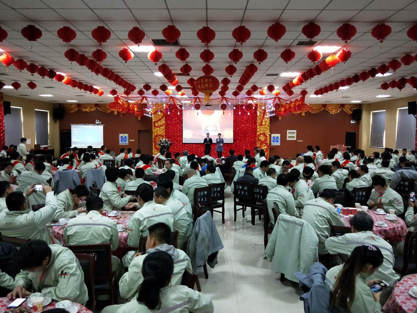隨后,公司對先進員工、集體、中層管理者以及勞動模范進行了現場表彰,年會穿插了節目表演、抽獎及游戲等環節,通過企業微信的后臺鏈接,廣大員工借助手機全程參與到了年會的各個環節中來,大家為年會紛紛留言,表達了對公司的片片真情,通過手機“搖一搖”、“數錢”等游戲一次次將年會推向高潮。年會在《像夢一樣自由》的歌聲中圓滿結束,現場所有員工通過聚餐的形式繼續著年會的歡樂和溫情。