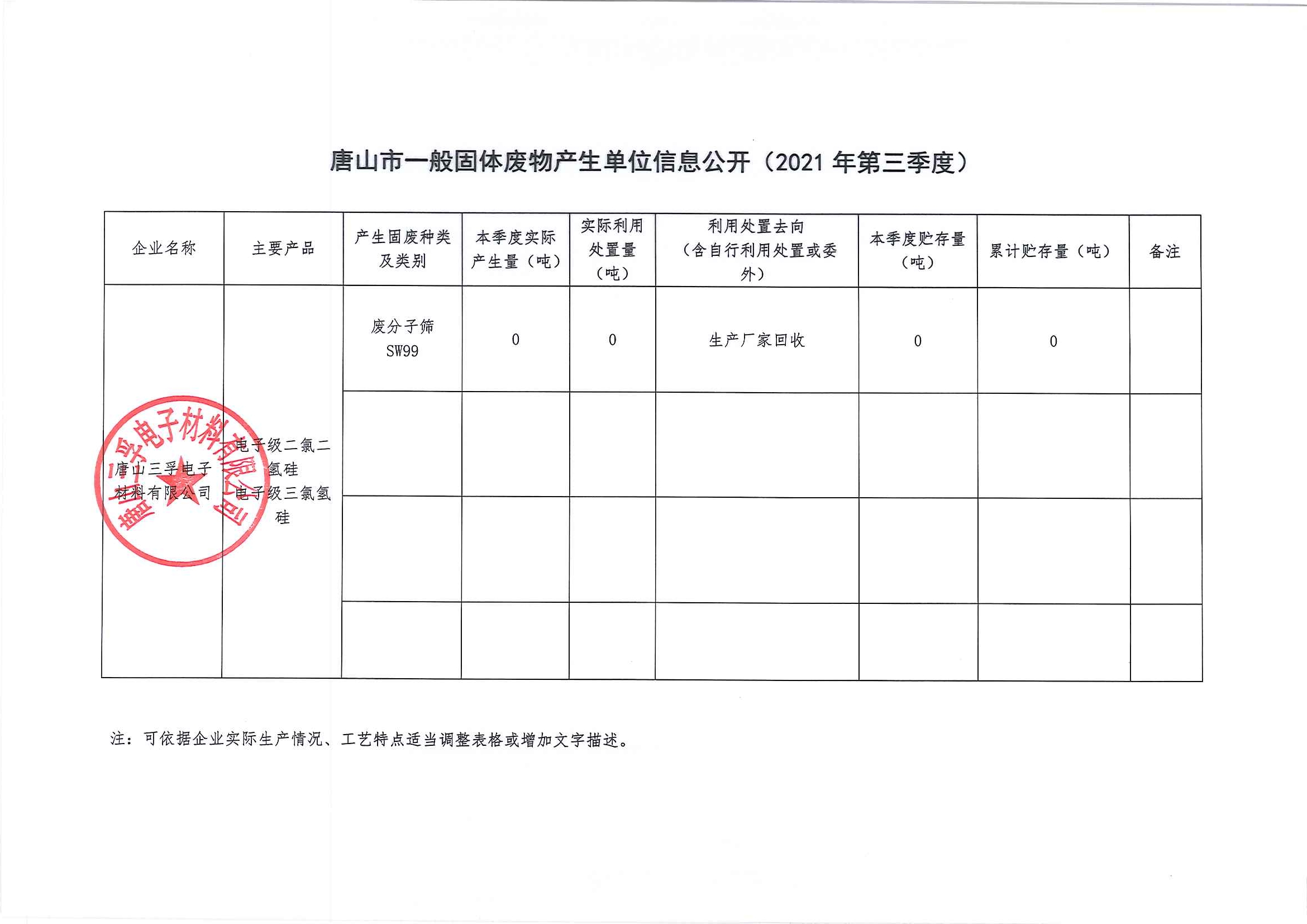 唐山三孚硅業股份有限公司2021年四季度一般固體廢物廢物信息公開