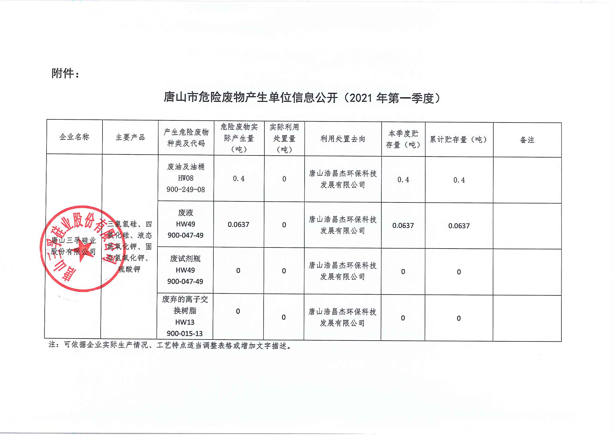 唐山三孚硅業(yè)股份有限公司2021年1季度 危險廢物產(chǎn)生單位信息公開