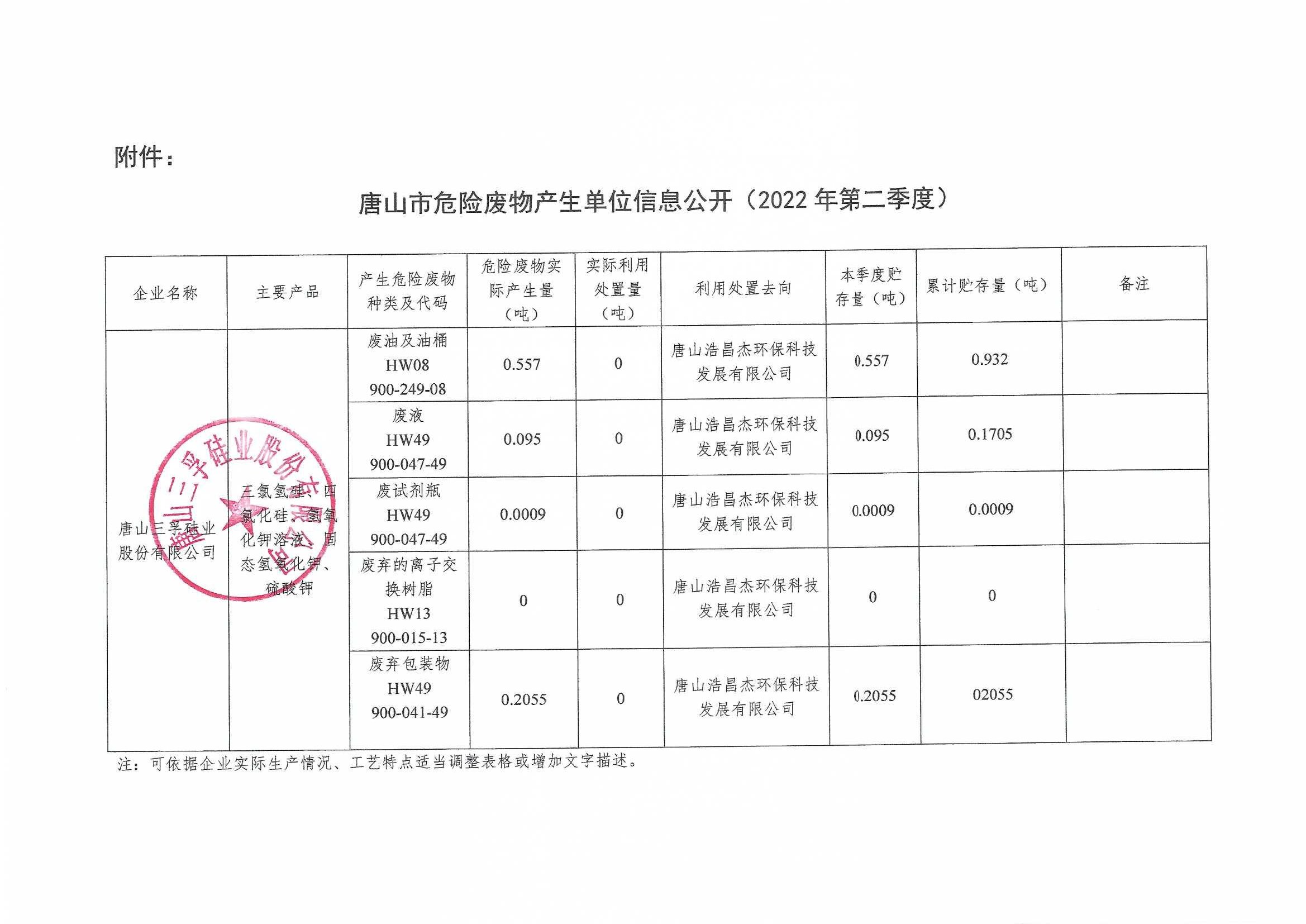 唐山三孚硅業股份有限公司2022年二季度危險廢物信息公開