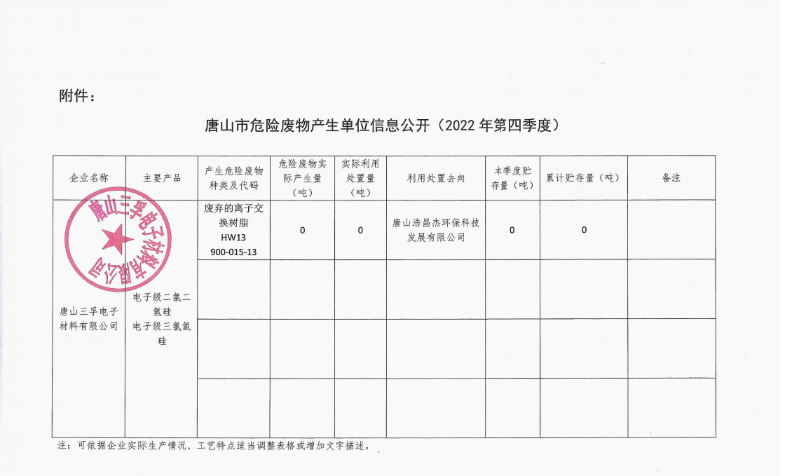 唐山三孚硅業股份有限公司2022年第四季度危險廢物信息公開