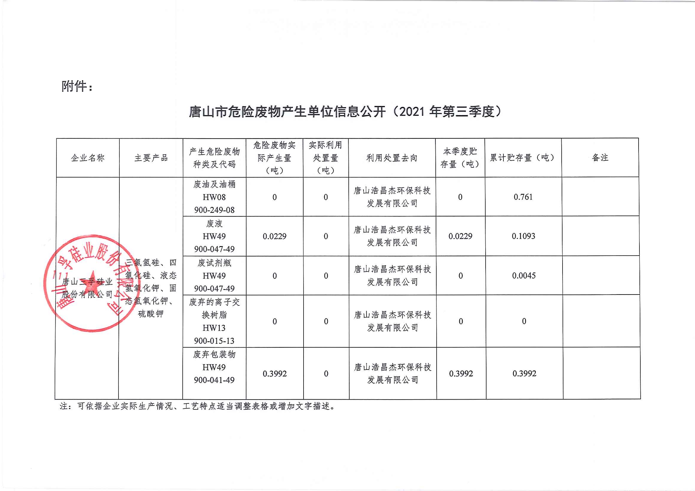 唐山三孚硅業(yè)股份有限公司 危險廢物 三季度信息公開